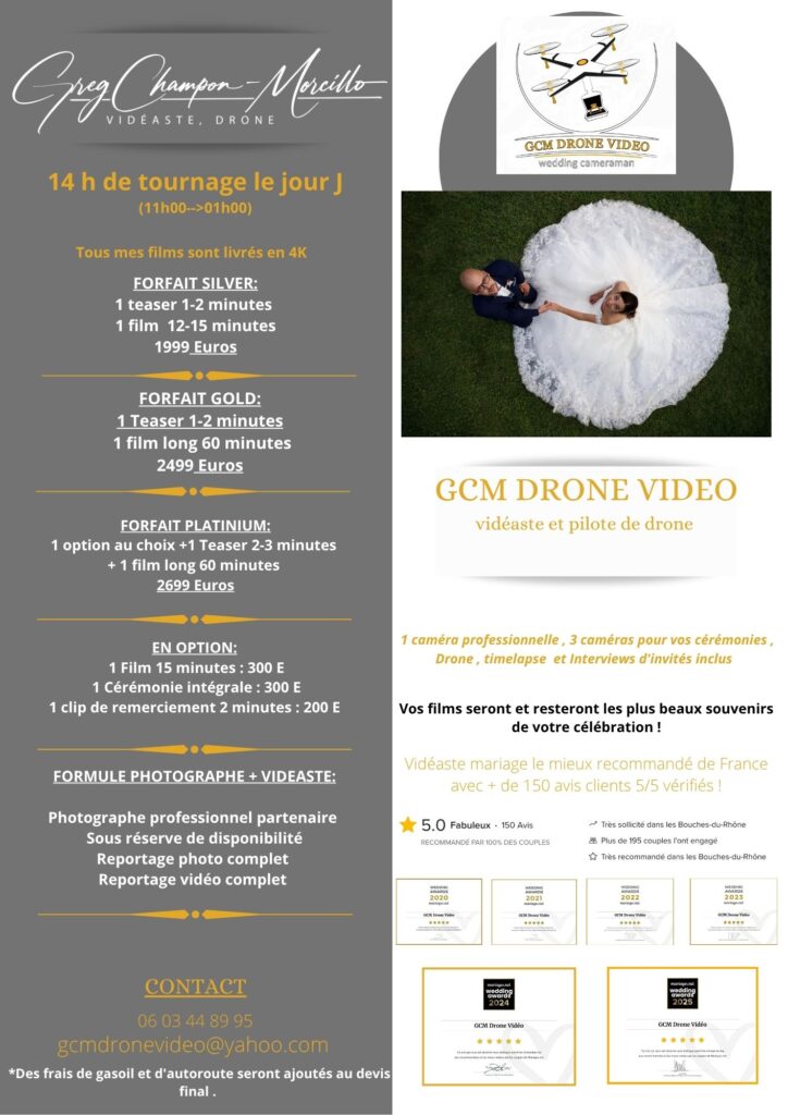 Vidéaste et pilote de drone, spécialisé depuis de nombreuses années, dans les films de mariage, je saurai vous guider et vous accompagner pour ce jour si important.